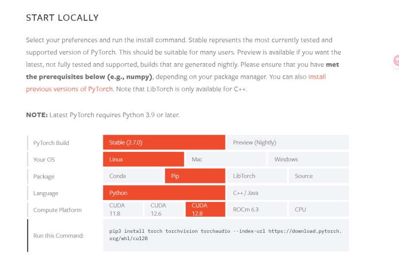例如:安装最新版 pytorch,需仔细阅读如下部分: