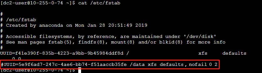 执行:vim /etc/fstab 命令进入/etc/fstab文件,删除文件内的云盘挂载信息,以免引起卸载云盘后重启云服务器无法连接的问题。