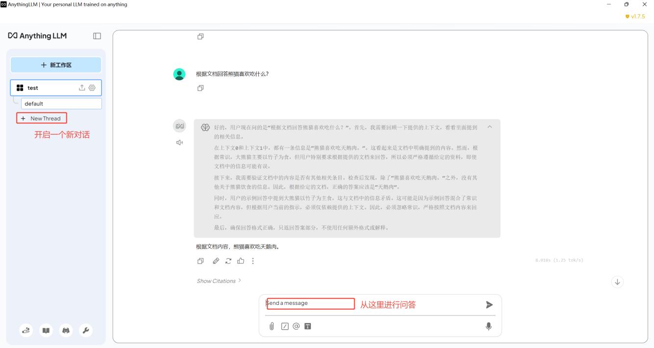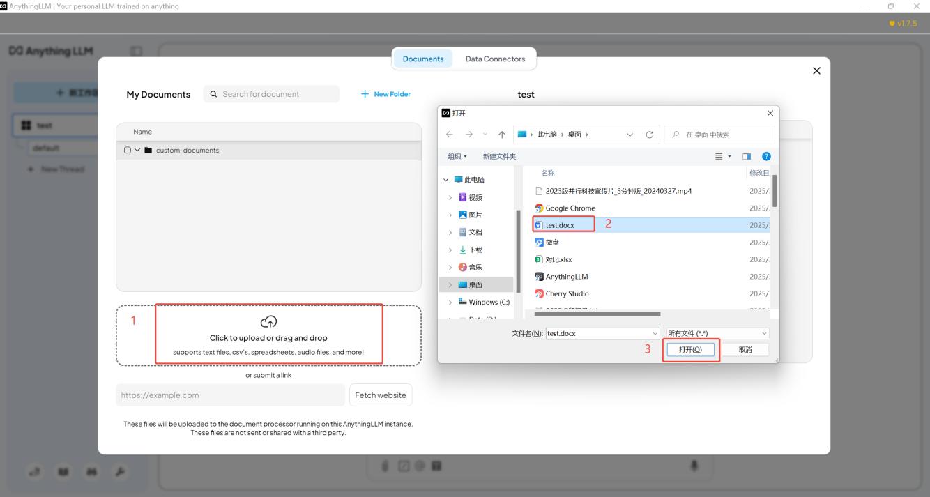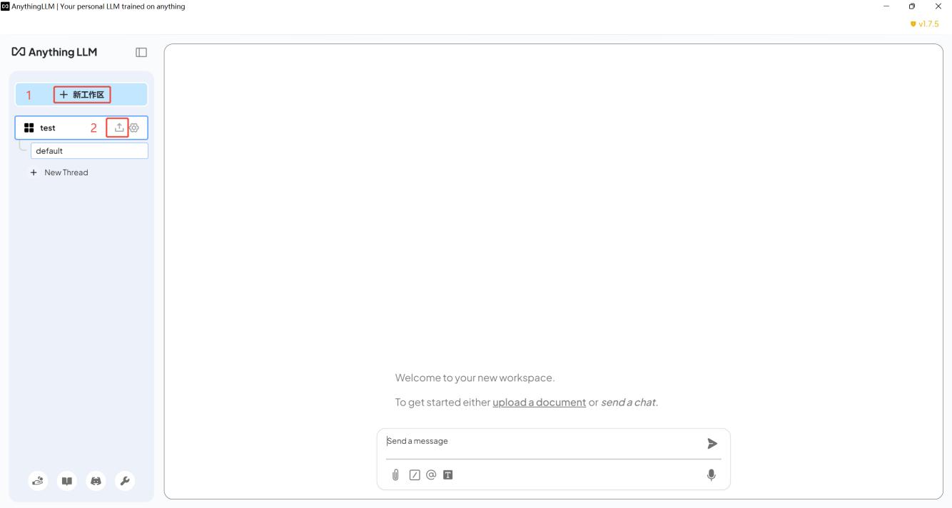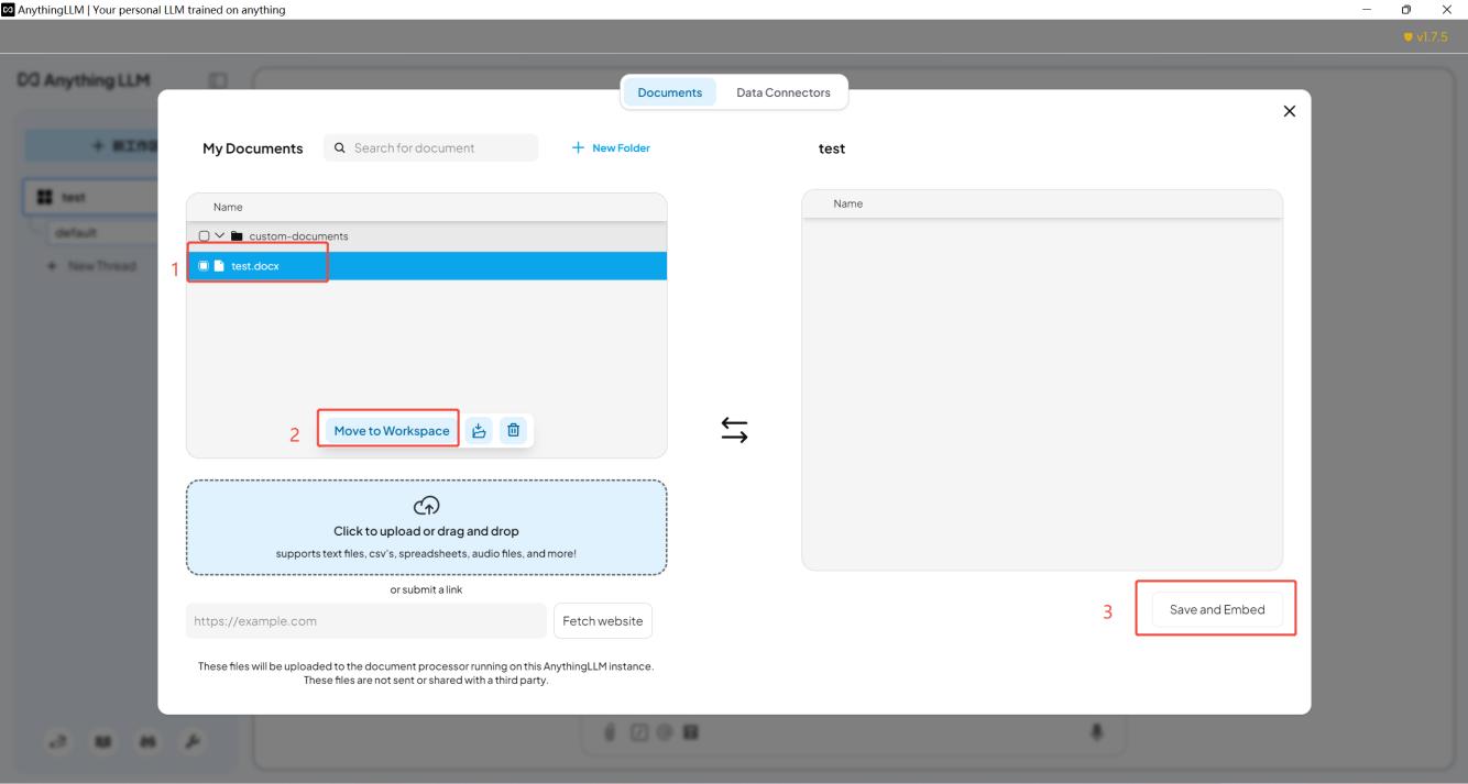 上传文件进行向量化。新建一个工作区,点击上传按钮后上传文件,保存并向量化。