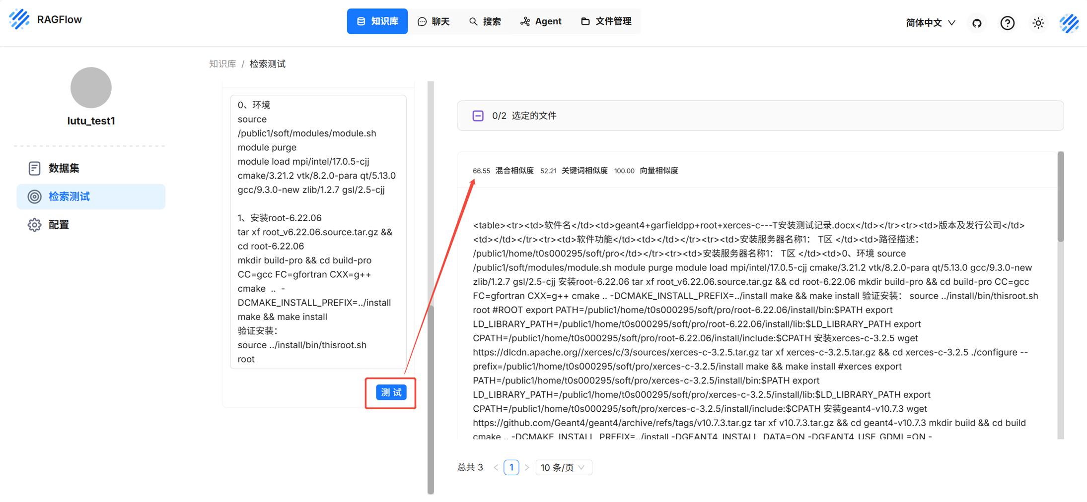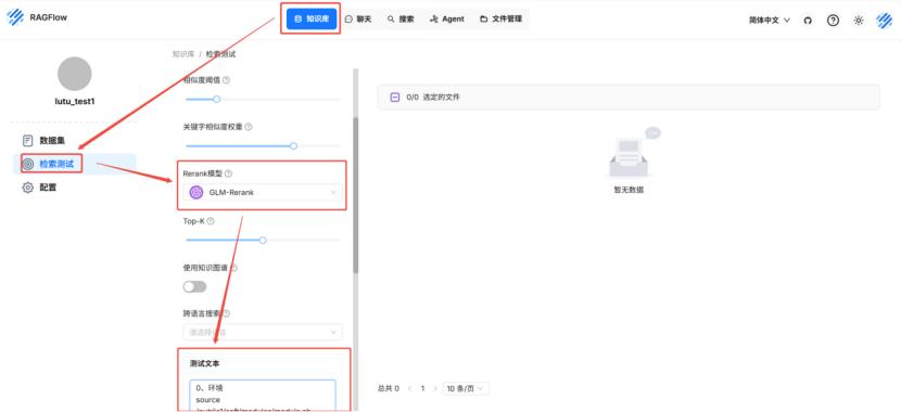 (5)rerank模型调用:选择知识库 — 检索测试 — 选择rerank模型 — 粘贴测试文本—点击测试